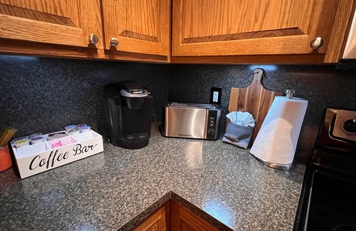 The open concept living/dining/kitchen area makes sure your group is always nearby. The living area has plenty of comfortable seating along with a 55" TV with Dish Network Satellite TV and a DVD Player. The dining area has a large table so your group can eat meals together. The kitchen is fully stocked with everything needed to make sure you can cook delicious meals: pots, pans, bakeware, dinnerware, silverware, wine glasses, chef's knives, spices, cooking spray. Appliances include a stove/oven combo, microwave, refrigerator, dishwasher, and a Keurig coffee maker, along with a starter supply of K-cups and sweeteners.