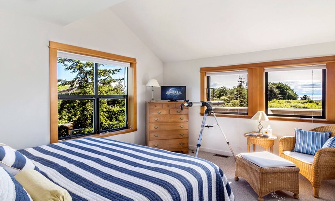 The layout of the two bedrooms upstairs makes it feel as though there are two primaries with separate bathrooms attached. This makes it ideal for two couples with a possible younger traveler as well. The top of the landing opens up to a small office area, and just past that is the half-room with a Queen bed. (Privacy offered with a curtain partition.) The primary Queen bedroom with en-suite bath is to your right, while the other primary King bedroom with en suite bath is to your left. Both offer beautiful views through the picture windows.