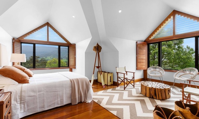 Off the living areas are two spacious, comfortable bedrooms with built-in robes and vast windows. Both rooms share a light-filled bathroom with a luxe bathtub and large walk-in shower. The first feature of the main suite, upstairs for added privacy, is a king-size bed, accompanied by a beautiful seating area and an ensuite.