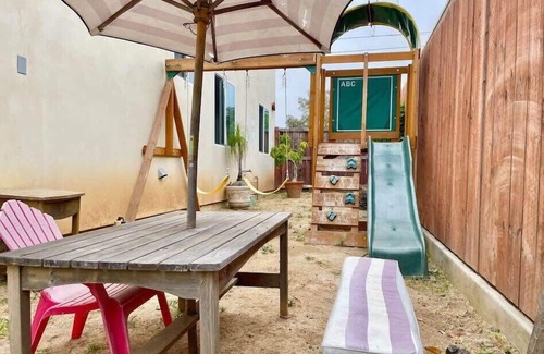 In our private backyard, you'll find a children's playset, toys, picnic table, outdoor dining table w/ umbrella, firepit, market lights, and propane grill! Be sure to plug those market lights in for some fun ambiance while grilling up your favorite dinners for your friends and family.