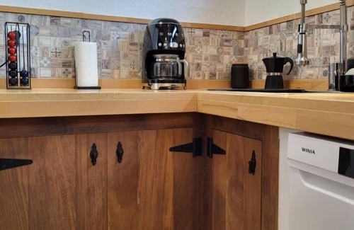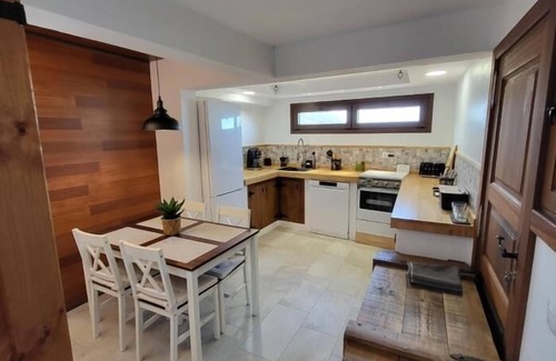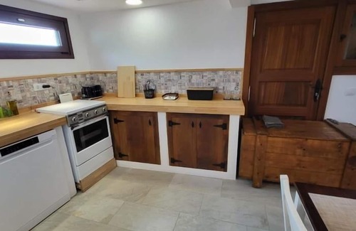 The living room, with its stone walls, exudes warmth and comfort. This cozy space invites you to relax and enjoy pleasant moments in good company. The fully equipped kitchen becomes the perfect setting for your culinary skills, while the patio offers you the opportunity to enjoy outdoor dinners