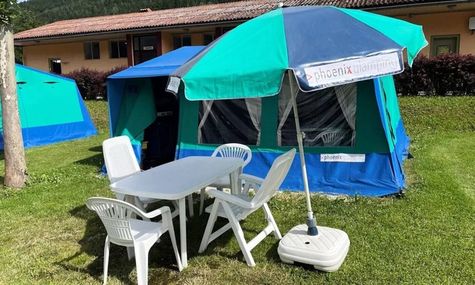 Accommodation: Inflating airbeds and hating the pegs into the ground yourself? No way, in the Navajo bungalow tent you'll end up in a well-spread bed. We set it up, furnish it and connect everything. With six real beds, a full kitchen unit, large refrigerator with freezer compartment for lots of ice cream, plenty of living space, garden furniture, electricity and lighting. You'll be the best-equipped camper at Lampele campite. The Navajo is made of durable materials and very price-friendly. Comfortable and economical camping.