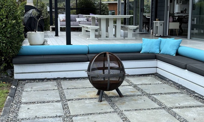 Loaded with all you need in the kitchen and laundry, a full desk set up if needed, Wifi, smart TVs and a heat pump to snuggle up in front of on cooler nights. A large covered louvre deck with outdoor seating, BBQ, pizza oven and fireplace. A separate fire pit to toast marshmallows, and a hot outdoor shower to rinse off after a day at the beach. Plenty of off-street parking for the car and the boat – and even a sandpit for the kids!