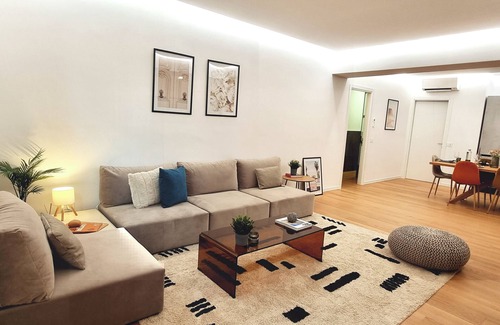 The spacious open-plan living room of over 50 sqm welcomes you with warmth and sophistication. Stylish sofas that comfortably seat up to 8 guests invite you to unwind after a day exploring the city. At the center, a 55” OLED smart TV offers top-tier entertainment. The double sofa bed is easy to open and comfortable for two people, making this a truly multifunctional space.