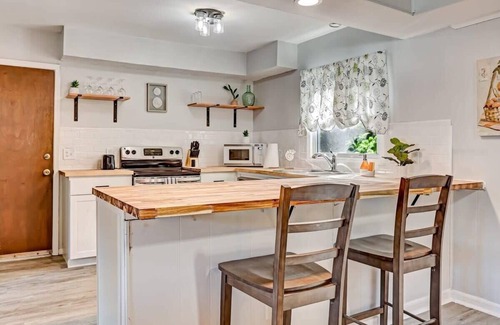***The pool is closed for maintenance. It will be noted here once it is open again.*** Guests will enter through the front door using a digital keypad. Once inside, you will be greeted into our cozy living room. Here you will find a large sectional couch with ample seating and can comfortably sleep two guests! The large flat screen TV is a SmartTV enabling you to connect to all of your streaming services. The living room opens up to dining room and kitchen making it easy to stay connected with family and friends! The beautiful farm table seats six and there is additional seating at the kitchen counter. The fully-equipped kitchen has beautiful butcher block counter tops, stainless steel appliances, and all the essential cookware/dinnerware items. Access to our large back yard is off the dining room making it a breeze to entertain outside. This home has four bedrooms. The master bedroom is on the main level and is furnished with a king bed, two arm chairs, large SmartTV, and an en suite bathroom. This bathroom features a beautiful clawfoot tub. The additional three bedrooms and full bathroom are upstairs. Two of the bedrooms each have queen beds. The final bedroom has two twin over twin bunk beds, a single bed, and a futon making it a great space for kids. Note: guests cannot access the garage.