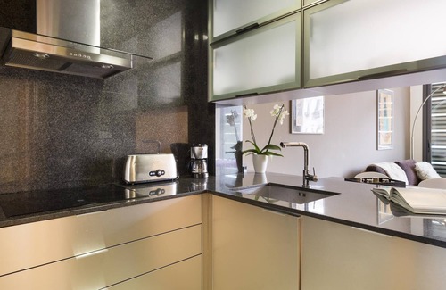 This bright apartment was designed to combine modernity and quality. At the entrance, you will find the fully equipped kitchen with all the utensils so you can prepare your own meals during your stay if you wish.