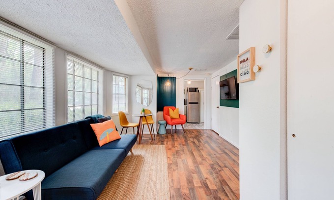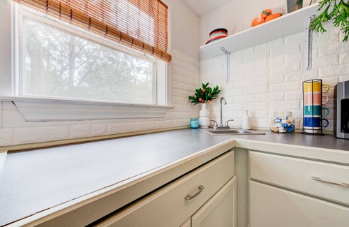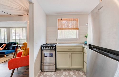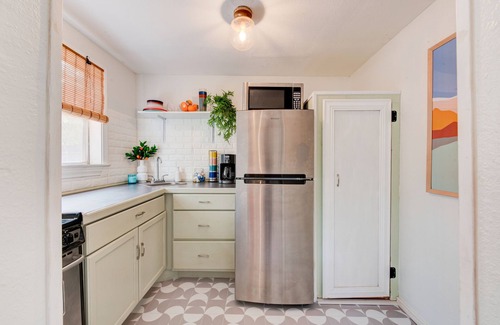 The Midcentury Modern Studio is located behind the main house & re-designed to create the ultimate Lubbock Vrbo experience! The use of bright colors, neutral textiles, & tropical greenery breathes life into the space creating a fun, chic, & relaxed atmosphere. Find yourself at home with the amenities provided such as quality coffee, WIFI, and TV with Roku (Netflix, Amazon Prime). The amazing location in this neighborhood is 1 min walking distance to a Local Hotspot of coffee, pizza, and supermarket!