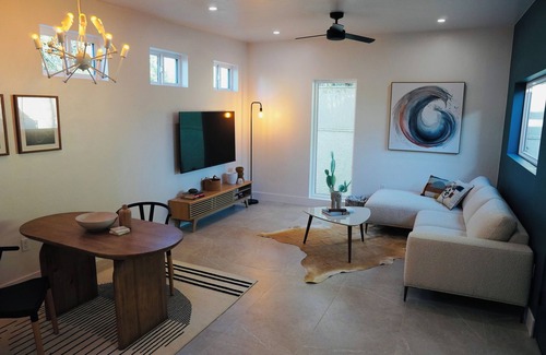 The space is airy, new, modern space with abundant light and a luxury feel. You can relax outdoors on the patio and private yard or lounge inside and enjoy the luxury design and finishes.