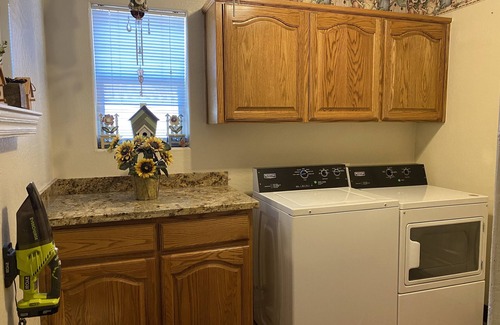 Entire House to yourself! Two-story, five bedroom-three baths, One bathroom downstairs. The Master Bedroom has two separate sinks, one stand-alone shower, and one large bathtub built for 2 people. The upstairs guest bathroom has two separate sinks and one tub/shower combo. The guest bathroom downstairs has one sink and one stand-alone shower. There are two large living areas that are separated by the kitchen. Large backyard with a natural gas barbecue grill by the pool (not a heated pool), a gazebo with lounge chairs and outdoor dining, and a grassy area for outdoor activities. There are pool floats located near the pool in the brown storage chest and more lawn chairs underneath the brown bench near the pool. Three driveway parking spots. Plenty of on-street parking. Beds for ten adults, four queen beds, and one king bed. In the master bedroom, there is a futon that can sleep 2 additional people once pulled out. Washer and Dryer available in the laundry room if needed. Plenty of floor space for sleeping bag camp-ins. You will love the place. The house can host 20 easily. The home was built in 2005. Photo opportunity staircase. It is a royal red staircase. The House currently has one 65" smart TV with Direct TV, Netflix, Hulu, and Amazon Prime for your viewing pleasure. The master bedroom has one 32" TV has one TV with a ROKU stick connected to it with Netflix, Hulu, and Amazon Prime for your viewing pleasure. There is another 55" TV with a ROKU stick and PlayStation 3 with games to play in the second living room area that will have Netflix, Hulu, and Amazon Prime for your viewing pleasure. In addition to that living area, all the bedrooms will be equipped with 32" ROKU smart TVs that will have Netflix, Hulu, and Amazon Prime for your viewing pleasure. There is also wireless internet for your use, the password is on the top of the main living room TV. For more information, feel free to email thomas.a.baxley@gmail.com or baxter1021@gmail.com.