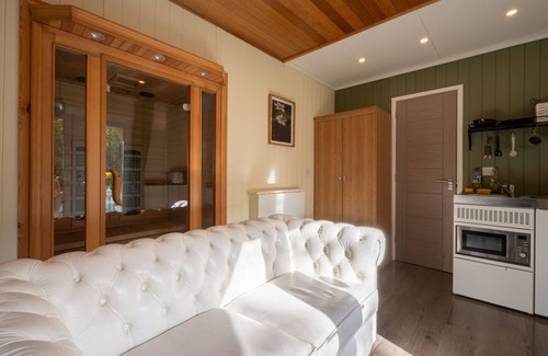 "Nessie 1", 1-room chalet on the ground floor. Comfortable and modern furnishings: open living/dining room with 1 double bed, dining table, shower/WC and TV (flat screen). Exit to the veranda. Kitchenette (2 hot plates, kettle, microwave). Small patio. Terrace furniture. Beautiful view of the river. Facilities: sauna. Parking. Please note: suitable for families. Fridge without freezer, non-smoking house. TV only EN.