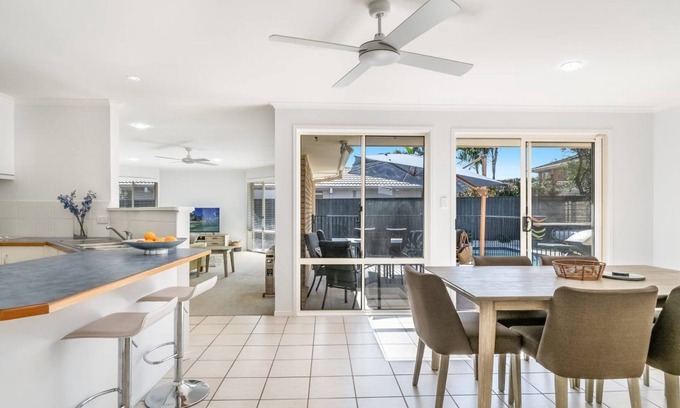 A great hidden gem, ideal for family accommodation or a couples escape, this contemporary home has everything you need for a comfortable stay in Lennox Head. The open plan living, dining and kitchen area offers plenty of space, and opens out to the private backyard where you can unwind overlooking the pool area. Imagine enjoying a BBQ while cooling off on those hot summer days and relaxing with an evening drink.