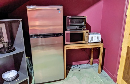 The cozy fully equipped kitchen has a microwave, toaster oven, dual induction cooktop, a fridge/freezer. Complimentary coffee and tea are provided. The dining table seats 4. Due to allergies there is a restriction on frying or cooking foods with strong aromas.