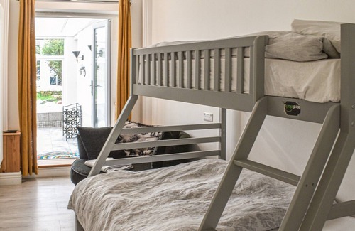 There are two bedrooms, one with a kingsize bed and Smart TV, and the other with a double bed on the bottom and a single bed on the top bunk, also with a Smart TV and cuddle sofa chair. The modern bathroom is located off the bedroom with a shower cubicle.
