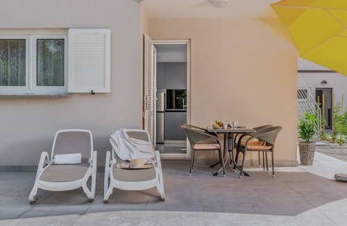 Experience unforgettable moments on our inviting terrace as you relax in comfortable loungers or dine together at the table with chairs. Our ground floor apartment promises to be a perfect retreat for fully enjoying your vacation.