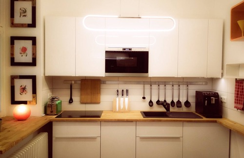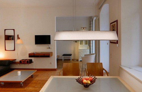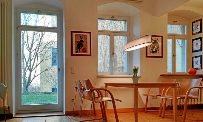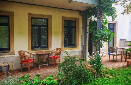 The apartment is located in Dresden's liveliest and most innovative district, in Dresden-Neustadt. Here, in the center of the pub and artists quarter, is the Kunsthofpassage - now a Dresden tourist attraction. The quiet apartment, with terrace and windows to the garden, has been carefully restored and is now an open plan apartment with a separate sleeping area and open kitchen - but with the charm of the early days through its more than 100 years old floorboards and doors.