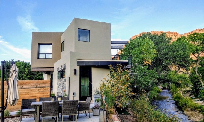 Perfect for family vacations, friend trips. Decks cantilevered over the Virgin River. 3-D video link at. https://my.matterport.com/show/?m=oHDHhNNWGqA Shuttle stop next door Approximately 3 miles from main entrance to Zion National Park. Each unit has laundry, full kitchen and amazing views. Top level, Observation Point has panoramic views of park, 2 story deck with hanging chairs from steel beams, two twin sized hanging beds, 2 bathrooms, 2 bedrooms, family room and dining area. Main level, Riverwalk, has large cantilevered deck, fireplace, 2 bedrooms (One has sliding doors to deck) and queen sofa sleeper. Lower level (Cannot be rented separately and is only included when the full building is rented) has 2 bedrooms 1 bath and sofa sleeper. Two separate patio areas with Bullfrog spas and barbeques. Feather bed toppers, high quality linens. Perfect location on Springdales shuttle route. You can park your car and not have to drive during your visit to Zion National Park. Walking distance to restaurants and shops. Backs onto Virgin River and park with great hiking trails. Unique architecture takes advantage of stunning views. Separate units afford privacy while still being together in one location. The town of Springdale is located at the main entrance of the park with a quaint charm and great selection of restaurants and art galleries.