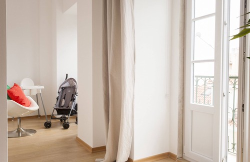 Excellent apartment with 2 bedrooms, renovated kitchen, living room with dining area, bathroom with bath and balcony facing west, with great views of the elegant Chiado district, Figueira Square and some monuments. 4th floor WITH elevator in historic building, classified and rebuilt about 10 years. Very bright. Light and warm decor. Wi-Fi and cable TV.