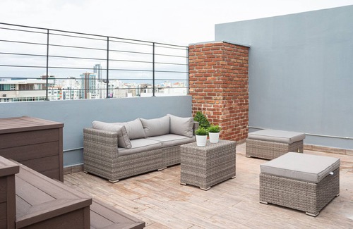 Industrial look and modern decor with a double height window view towards the south of the city and the Caribbean Sea. Also in the first floor you will find an open kitchen fully equipped and spacious living room with a 55¨tv. There´s also a laundry room. An open staircase lead you to the second floor where you will find a very confortable queen size bed, dressed up with pillows, cotton sheets and duvet with a full bathroom and another 42¨tv. Finally in the third floor you will have an open and private terrace that has a jacuzzi and a great view of the city and the Caribbean Sea.