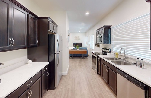219 E 17th has 3 bedrooms each with a queen bed, but what's more? Its not just 3 bedrooms. Its a fully self-contained place, no sharing, with its own separate living room, dining, and full kitchen area with a full set of cabinets, a FULL refrigerator, stove, oven, microwave, dishwasher, and.... oh, and coffee? Of course... both a Keurig and a drip coffee maker for whatever your high octane (or decaf) desires may be! Table behind sofa can be opened to seat up to 6 too. Note, NO the living room coach is not a sleeper sofa. We intend this for up to 6 people, and have not included QSS or other 'people packing' features. Nice place. Perfect location. Comfy. Not for large groups.
