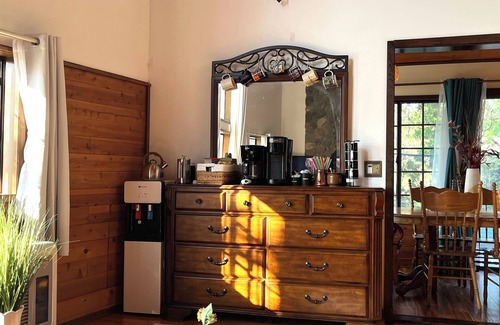 In the adjoined dining areas, you'll find a fully stocked coffee station and 3 separate dining tables, (with 14 seats total, including the kitchen island stools.) You'll also find a large comfy window bench from which to admire the giant oak just outside and the gorgeous mountain range in the distance.