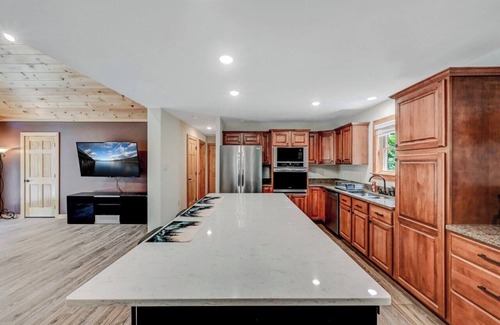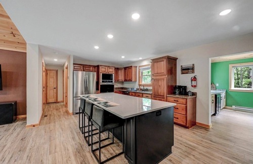 Tree Haven was built in 2021. Everything is new and clean and inviting. The kitchen is large and has plenty of room for cooking. There are stocked small appliances, such as a hand mixer, waffle maker, toaster, and a blender. There are three coffee makers: a drip pot, a single cup for pods, and a French press. There is also a tea kettle. We have some various coffees and teas stocked, or bring your favorite.