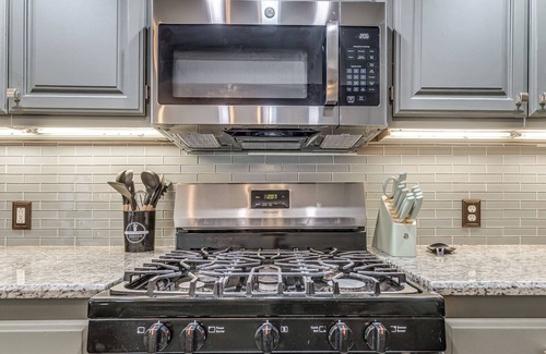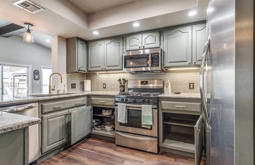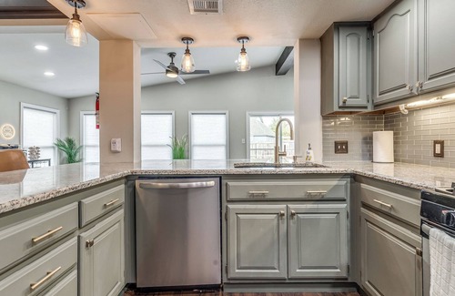 Spacious five-bedroom, three-bathroom home features a video game arcade, a large hot tub for relaxation, and a coffee bar for your morning brew. Enjoy cooking in the designer kitchen, equipped with ample counter space, and share meals at the large dining table. Cozy up for movie nights on the large TV. 2 minutes from River Spirit Casino, 6 minutes to Tulsa Hills Shopping Center, and 15 minutes to downtown Tulsa. TV and beds have LED lights.