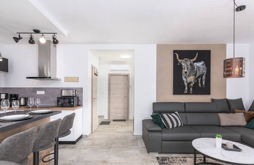 Villa Galeria is a new, beautiful, and modern luxury villa with a private pool, suitable for 8 persons. It is equipped with high quality furniture. The villa consists of a living/kitchen room with a view of the crystal-clear swimming pool. The kitchen is equipped with appliances such as electric stove, oven, microwave, dishwasher, etc. The dining room and living room are situated on the ground floor. The villa has 4 bedrooms with double beds; one bedroom is located on the ground floor, the other bedrooms are located on the first floor. Two bedrooms have their own bathrooms. All bedrooms feature a Cable-SAT TV. The villa is fully air-conditioned, and it offers parking for 2 cars in a fenced yard. The interior design of the villa will delight its guests with decorative details such as paintings, which painted the owner of the house. If you are planning a relaxing, peaceful holiday in luxury and near the beaches, this is the right place. Pets are welcome, with an extra charge payable on the spot.