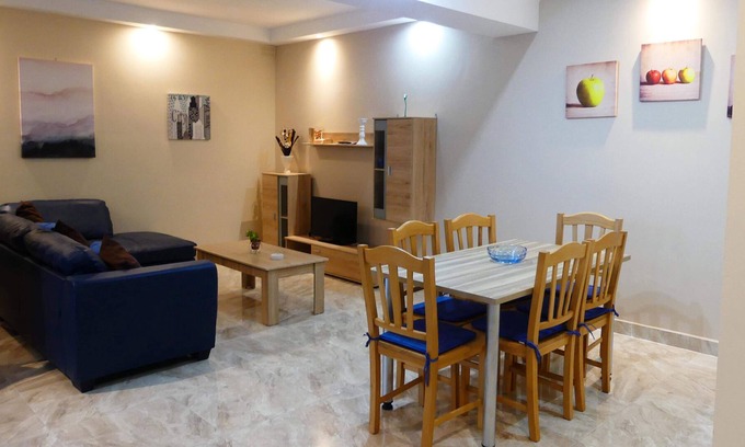 The apartment features 3 bedrooms, a flat-screen Tv with cable channels, an equipped kitchen with a dishwasher and a fridge, a washing machine, and 2 bathrooms with a hot tub.