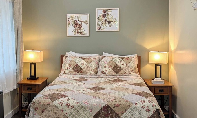 Our lovely cabin is tucked away in a woodland setting and is pleasantly rustic, clean, and comfortable.