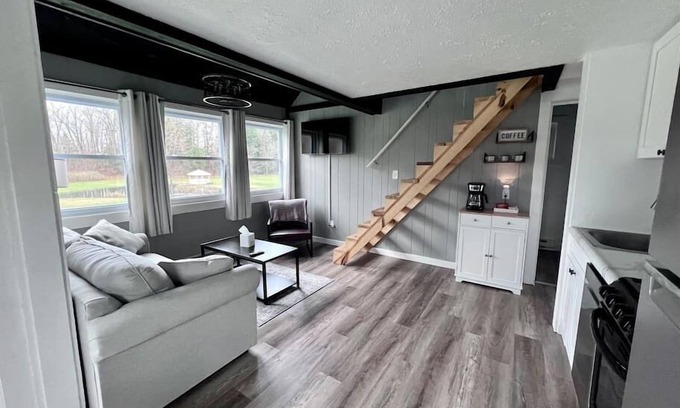 Newly renovated chalet nestled on 15 acres within minutes of Conneaut Lake, Firemans Beach, Icehouse Park, Barbara J Cruises, Conneaut Cellars Winery, restaurants, coffee shop, gift shops, and more. There are 6 chalets on the property. Laundry facility and free parking onsite. 15 minutes from Meadville.