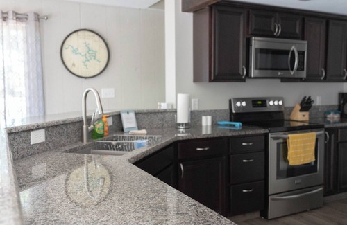 Your Sunrise Beach adventure begins with a beautiful 4-bedroom house, located right by Hurricane Deck bridge. By land or water, you are in the middle of all the action and adventure. With 3 queen beds, (two that are suites), 1 twin bunk bed over a full, you will rest easy in this amazing property with plenty of space for all guests. The kitchen and half bath are right off the large deck which makes it perfect for entertaining. Enjoy ONLY having a FEW STEPS to the dock where you can swim and enjoy the water with our lilly pad.