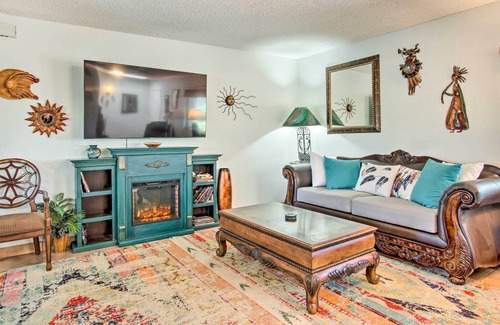 Experience authentic southwestern style at this vibrant home in Green Valley! Inside the vacation rental, you’ll find 2 bedrooms, 2 baths, an office space, and a well-appointed living room perfect for relaxing by the fireplace or watching a movie on the Smart TV. Soak up some Arizona sunshine in the backyard — whether you enjoy happy hour on the patio or take a dip in the pool, you’ll be surrounded by views of the unique murals lining the fence and the sprawling desert landscapes beyond.