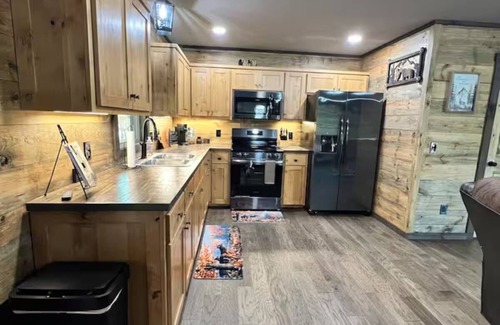 The fully furnished kitchen is equipped with brand-new stainless steel appliances, cookware, dishes, and all the essentials needed to prepare anything from a romantic dinner to a hearty country breakfast. Whether you’re grilling on the outdoor charcoal grill or sipping coffee on the front porch rocker, every detail has been created to help you slow down and savor the moment.