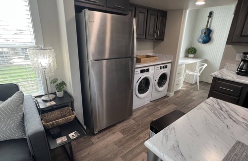 A Park Model tiny home close to a sandy beach. Although it sleeps 7, it sleeps 4 very comfortably - remember it is tiny in space! It includes beach items, a charcoal grill & even an outdoor shower! Ideal for a family stay.