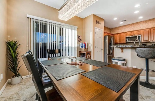 When you stay at this single-level home, shared amenities include walking/biking trails, basketball, playgrounds and more. Relax for movie nights on the flat-screen TV in the living area. An indoor electric fireplace sets the mood for cozy nights in. The provided children’s games and board games guarantee extra fun for the whole family. To have full access to the Anthem community center there is an additional fee of $90 for a 90 day pass for up to two people. This is optional if guests wish to enjoy full access to the community center pool, gyms, tennis, pickle ball and seasonal water slides.
