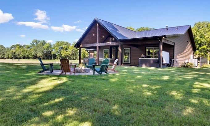 This beautiful, modern cabin-style home offers a relaxing retreat, combining rustic charm with modern amenities. The spacious outdoor area features a cozy fire pit surrounded by colorful Adirondack chairs, perfect for evening relaxation or gathering with friends and family. The expansive lawn provides a perfect space for outdoor games or simply enjoying nature, with a serene, wooded backdrop.