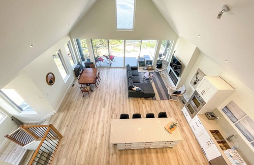 This 2-level lakefront home features an open concept main floor living room, electric fireplace, bedroom on main, bathroom and gorgeous kitchen with double wall oven, 36” induction cooktop, large island with seating, dining table and stunning 3-piece bathroom plus an expansive private deck with BBQ. The upper bedroom features a queen bed.