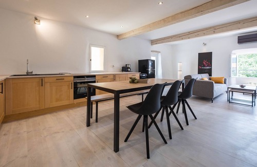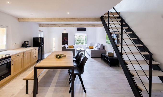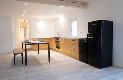 In this renovated duplex with a covered terrace and a view of the Canigou you can relax in the heart of Céret. The minimalist design with a nod to an industrial atmosphere is equipped with every luxury. The photogenic narrow street immediately brings you to a southern city atmosphere where you can relax 300 meters from the Museum of Modern Art. All facilities within walking distance.