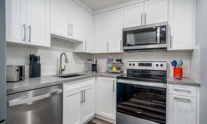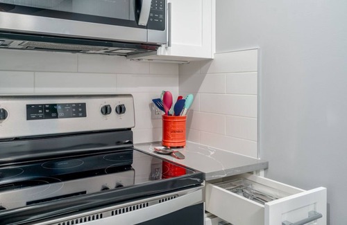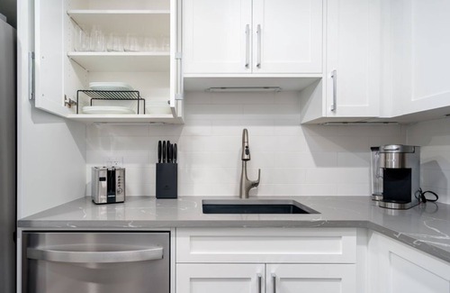 Spacious bedroom w/king bed, 55" TV. Ceiling is very high, won’t feel like you are in a basement. Get comfortable in the spacious living room w/queen sofa bed & enjoy a movie on the 65" TV watching Netflix (personal sign-in required). High speed. Spa shower.