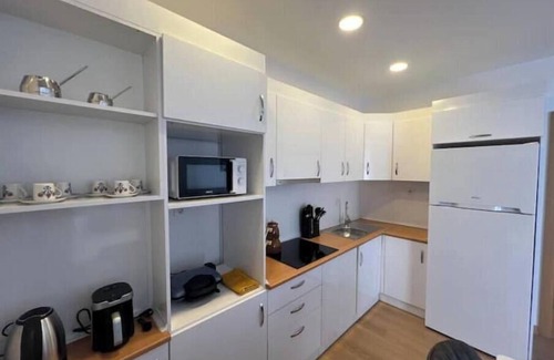 Kitchen Equipment is fully equipped. Refrigerator, Stove-Hood, Microwave, Kettle, Coffee machine-cups, Citrus juicer, Blender, Cookware set, Cutlery set, and all your other needs are available.