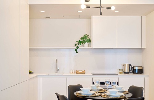 The kitchen is fully equipped with state-of-the-art appliances. It features a clean, sleek design with ample workspace to prepare meals and all the cookware and utensils you may need during your stay.