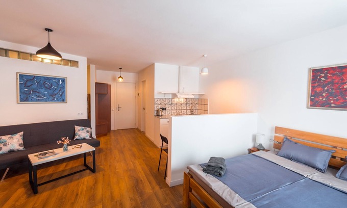 Kitchenette has a dining table and in living area there's a small table with sofa, plus two puffs.
