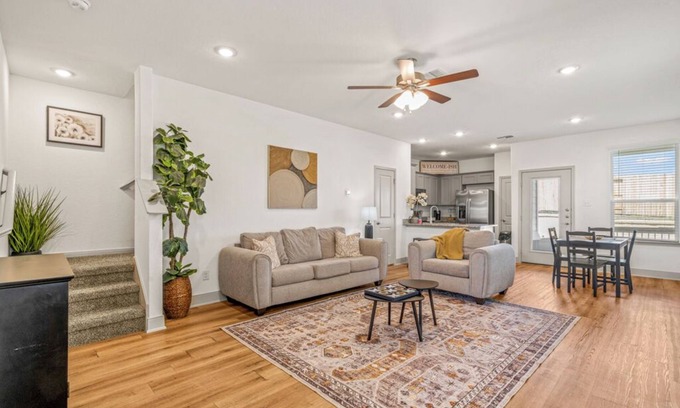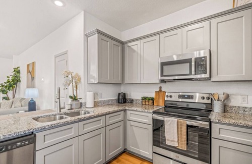 This newly built 1500 sq ft duplex is designed for comfort and relaxation. The spacious open floor plan downstairs features a cozy living room equipped with a smart TV, a modern kitchen, and a convenient half bath.
