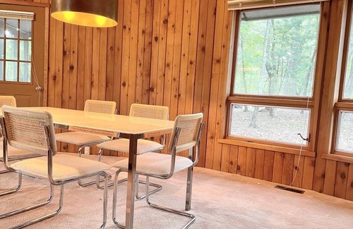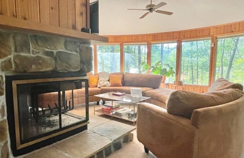 NEW! Sexy! Dog-friendly Mid-Century MODERN one-level home that is both woodsy and on the golf course. Close to DC and Baltimore!! Sleeps 6-8 in SUPER COMFY beds w/high-quality sheets, pillows & towels Deck w/Grill & free propane. Modern ultra-stocked kitchen. High speed wifi + work space. Screened-in porch. Free firewood. Basic supplies provided. Hike + golf + swim + ski+ fish + spa + shopping + farm markets nearby. In-home personal cheffing by Chef Adam available. We are Honey House Homes.