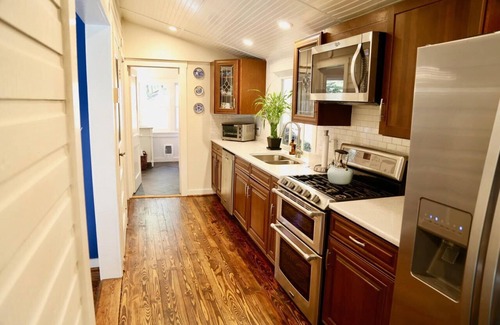 Full kitchen stock coffee maker, microwave, gas range/oven, dishwasher, toaster oven, and blender. Sheets, towels, shampoo, conditioner, and bath wash provided.