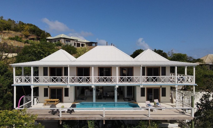 Amazing Ocean Views of the South Coast of Antigua! This newly built 5 bedroom, 5 bathroom, 3 level house is located at Turtle Bay, just a short drive from English Harbour. It is the perfect place to chill out and relax or watch a Sailing Regatta! With balcony access off of every bedroom, you'll be cooling off in the pool watching the sunset in no time. The house has an upstairs kitchen and living room, a downstairs bar and lounge area, parking, wifi and lots more!