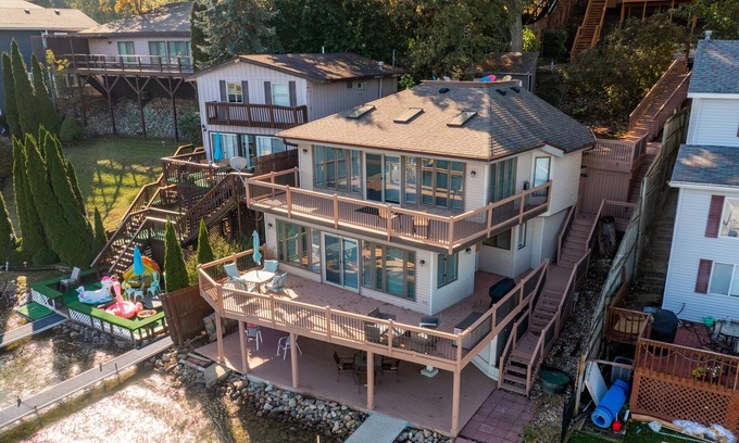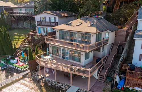 Bring the whole family to this great place with lots of room for fun. 1 King bed, 2 Queen beds, 4 twin beds & a super comfy couch. Full access to the boat dock included during summer months! Natural gas grill in the back, bar on the basement deck and the view! Bring the entire family!