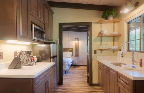 Cabin 5 has a living area with Queen Memory Foam Sleeper Sofa and TV as well as a Dining Bar that seats 4, a well equipped Kitchenette stocked with everything you need to make a wonderful meal or just store your leftovers from one of Sedona's fine restaurants! There is also a bedroom with a TV and 2 Queen & 2 Twin beds and can sleep up to 6 people. There is 1 bath with a walk-in shower featuring a skylight! There is also a patio and Fireplace with electric insert for ambiance!