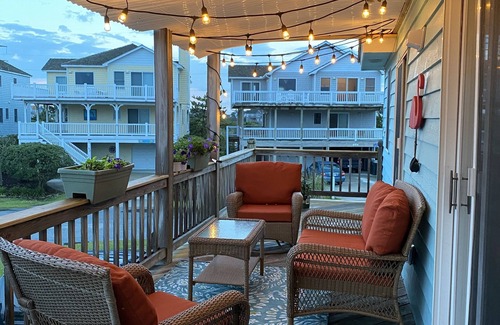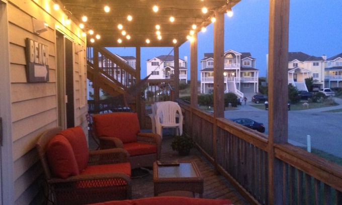 Our cottage is ideally located in the Village at Nags Head, just a short walk down the cul-de-sac to our beach access—only two doors away! It’s quick and easy to run back from the ocean. The cottage features plenty of outdoor spaces, including one that is embellished with party lights.