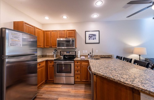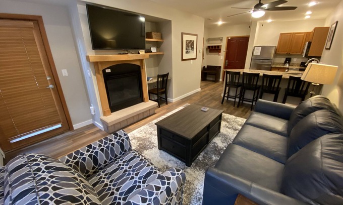 This newly remodeled luxury 1 BEDROOM / 1 BATHROOM condo SLEEPS UP TO 4 PEOPLE, with enough room to spread out comfortably. The comfy and cozy living space includes a gas fireplace, 50” 4HD wall mounted home theater smart TV to stream your favorite apps including Netflix, Youtube, and Hulu, a large assortment of games/books/toys, iHome speakers to stream your music playlist, free wireless high-speed internet. An updated kitchen with granite countertops and stainless appliances is outfitted with everything a chef needs to prepare a family dinner or breakfast before hitting the slopes. The master bedroom has a KING SIZE BED (luxury mattress) flat-screen HDTV and Beautyrest Pillows. Additional sleeping accommodations; 1 QUEEN SLEEPER SOFA (very comfy -memory foam mattress.) High-quality linens make sleeping truly restful after a day of mountain play. Step outside onto a deck to listen to the river and see all the beauty that surrounds Winter Park.